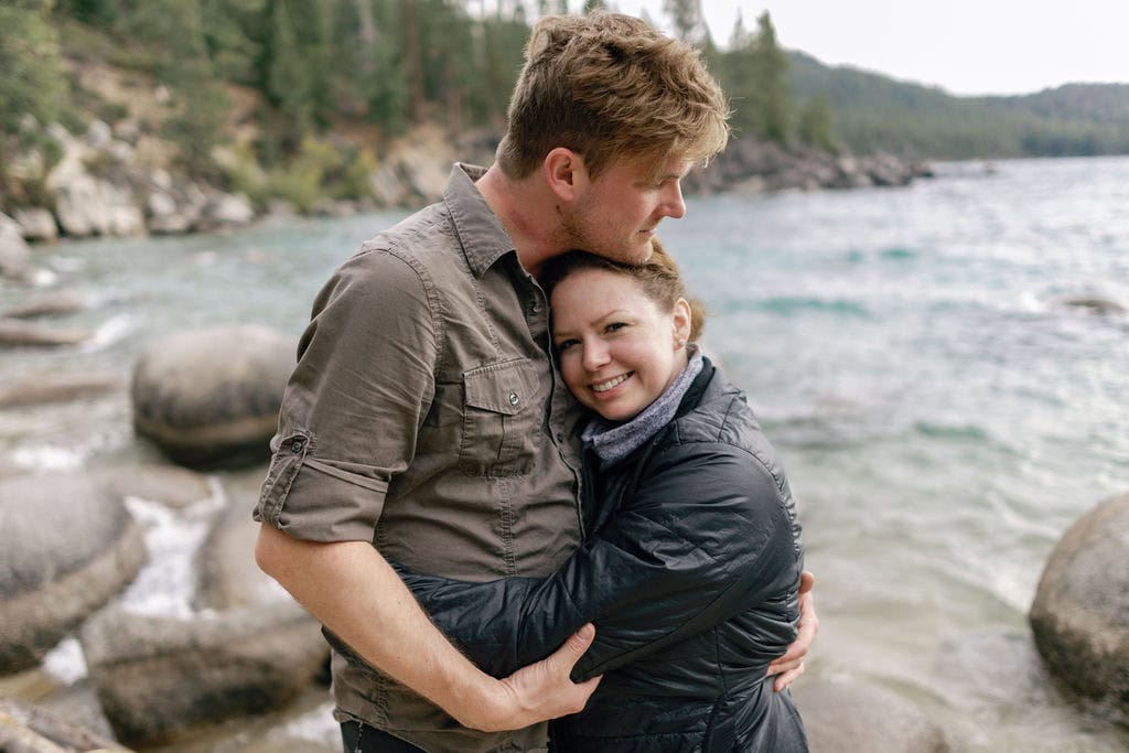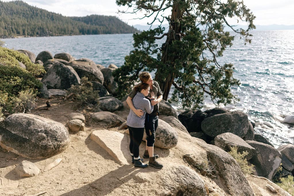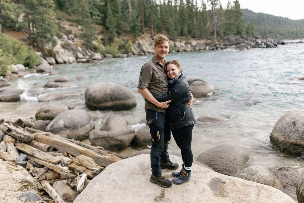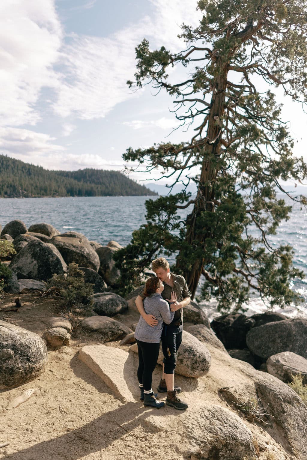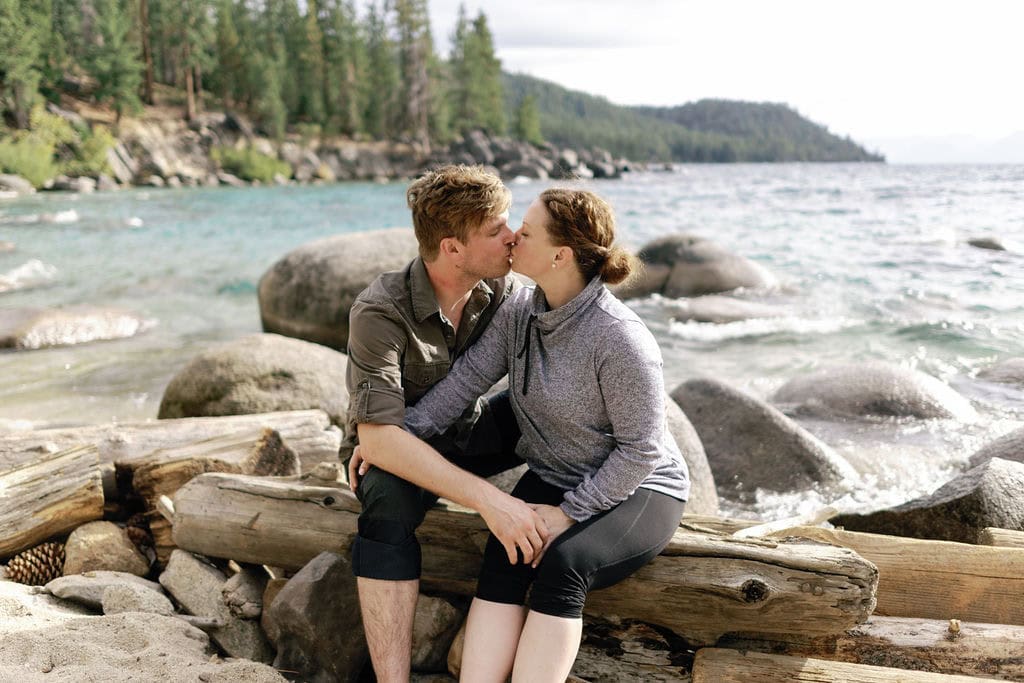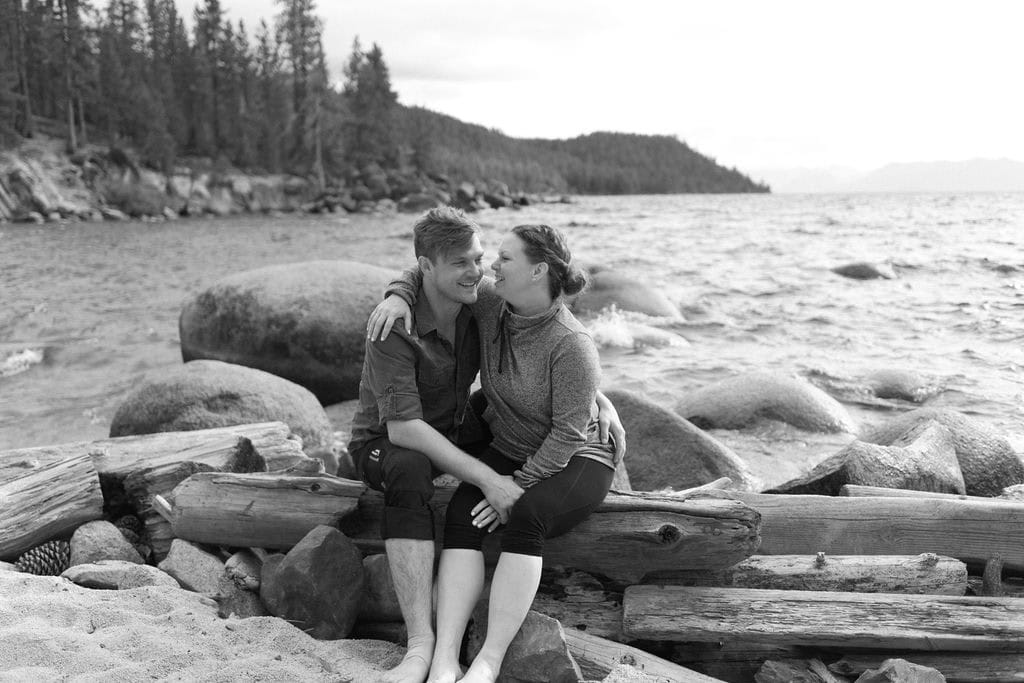 We started at Secret Cove, one of Tahoe’s hidden gems. The wind picked up that afternoon, sending ripples of choppy waves across the normally calm water. Instead of shying away from it, Katlin and Kyle embraced the energy of the day, laughing as the wind caught her hair and the waves crashed against the rocks. Their playful spirits made every moment feel effortless—they’re the kind of people who radiate joy and are such vibrant humans to be around.