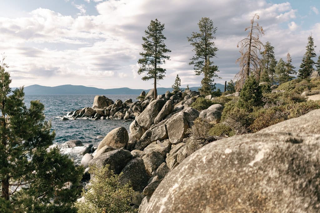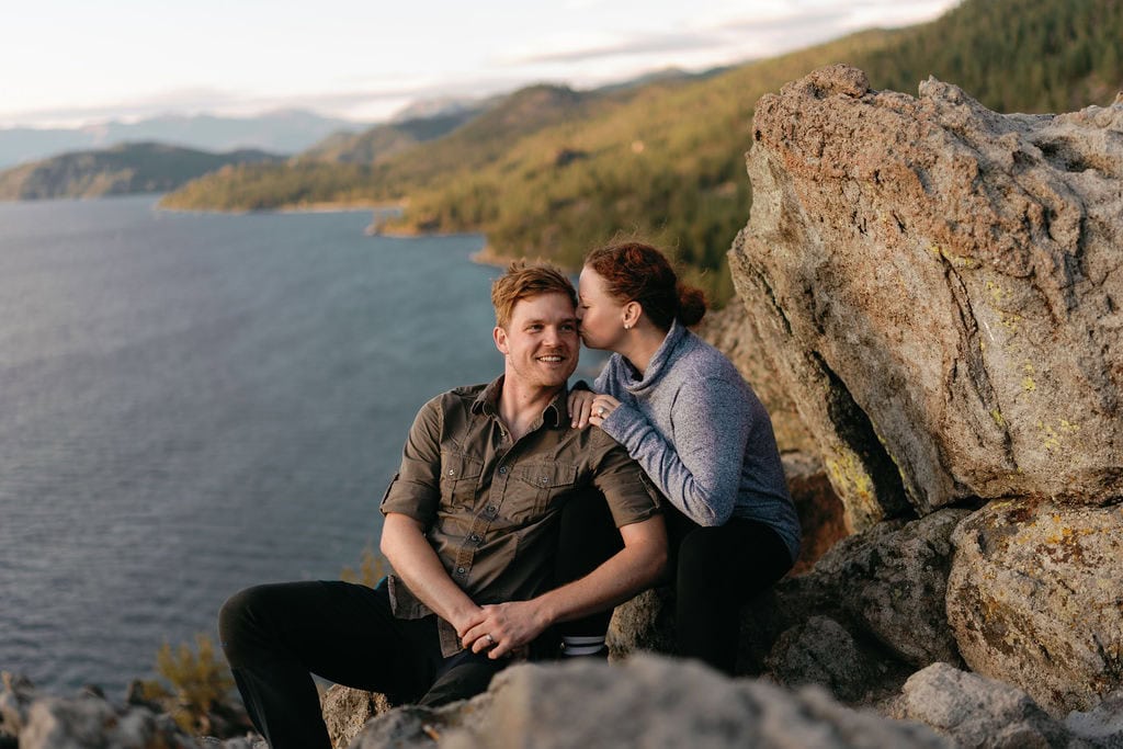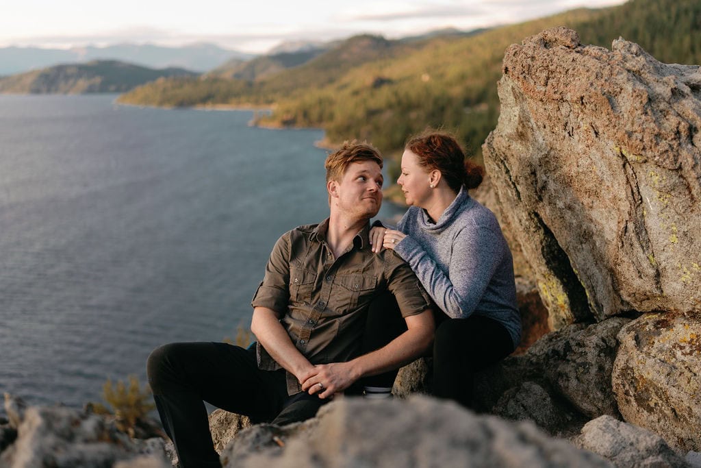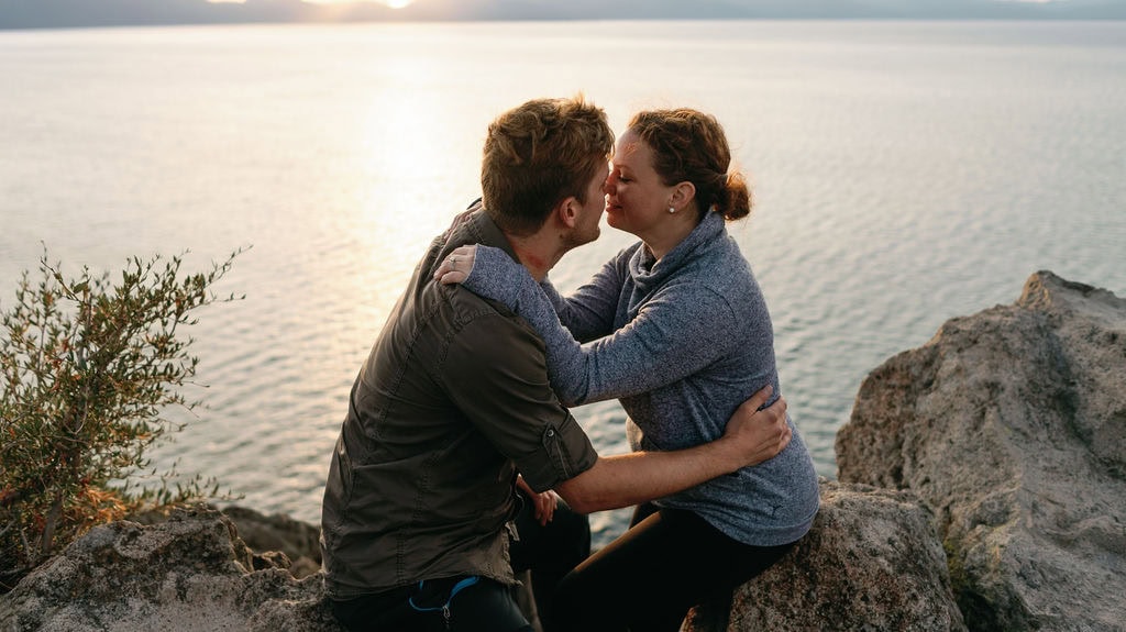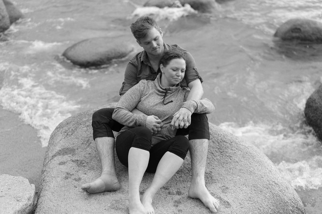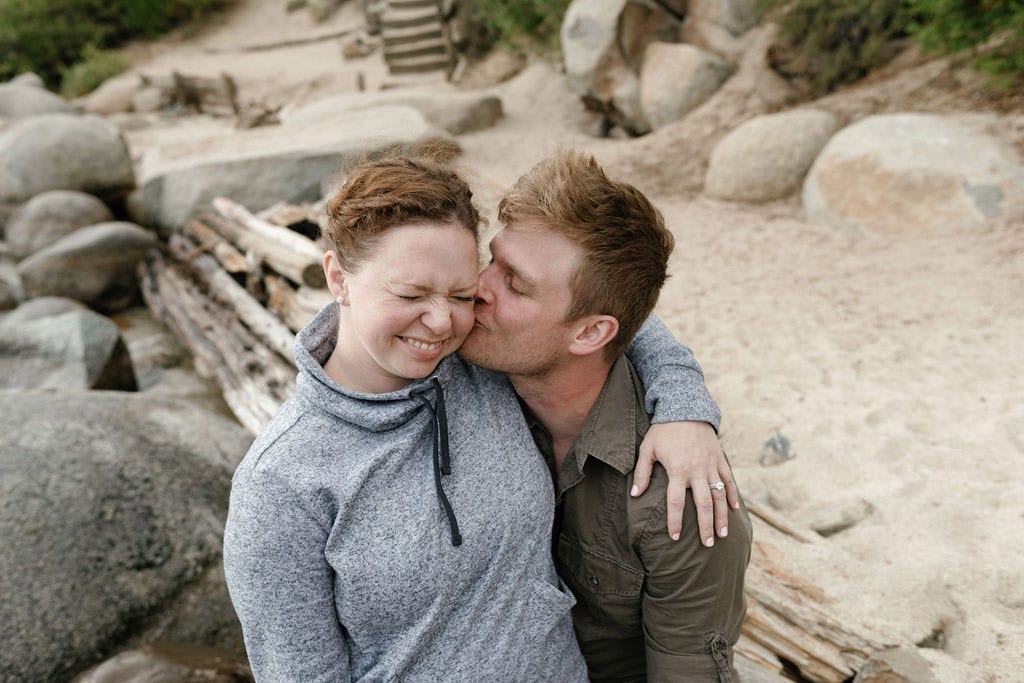 We started at Secret Cove, one of Tahoe’s hidden gems. The wind picked up that afternoon, sending ripples of choppy waves across the normally calm water. Instead of shying away from it, Katlin and Kyle embraced the energy of the day, laughing as the wind caught her hair and the waves crashed against the rocks. Their playful spirits made every moment feel effortless—they’re the kind of people who radiate joy and are such vibrant humans to be around.