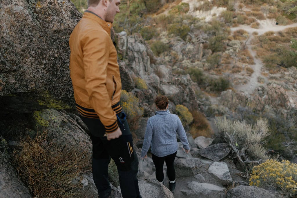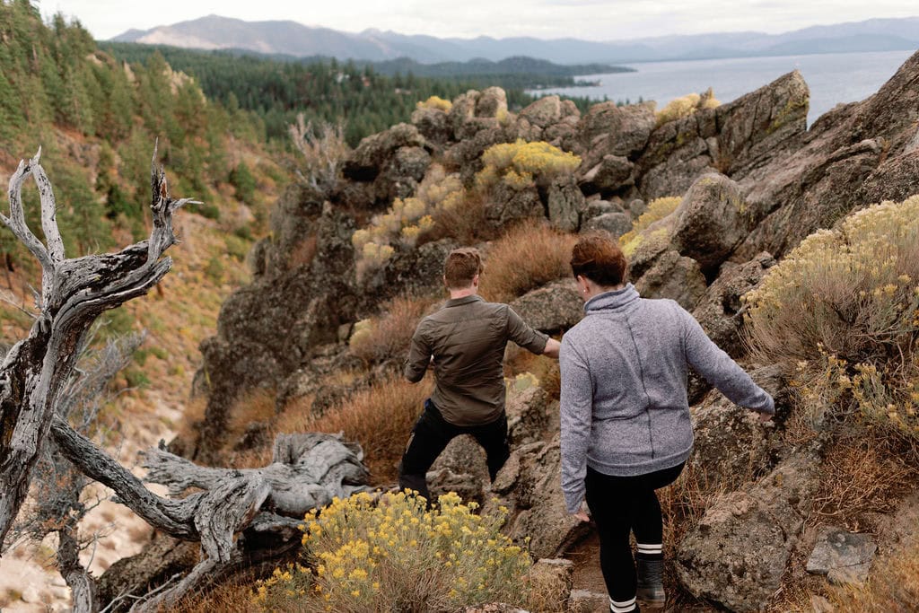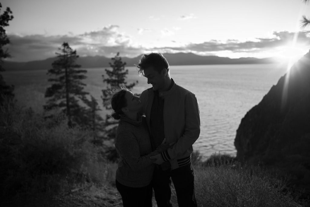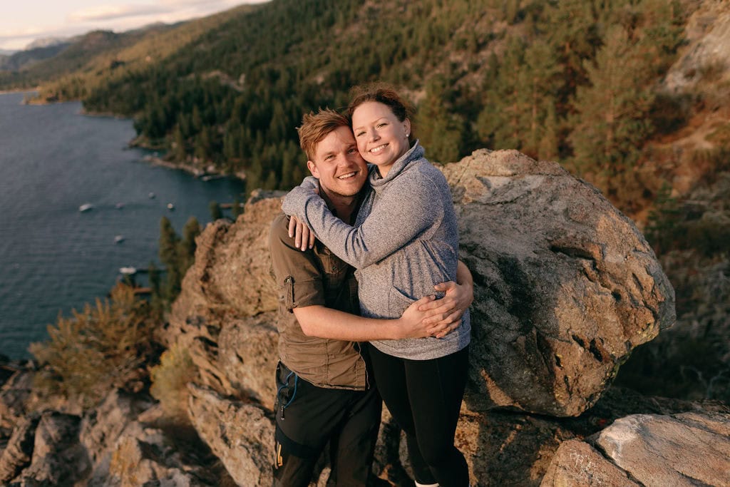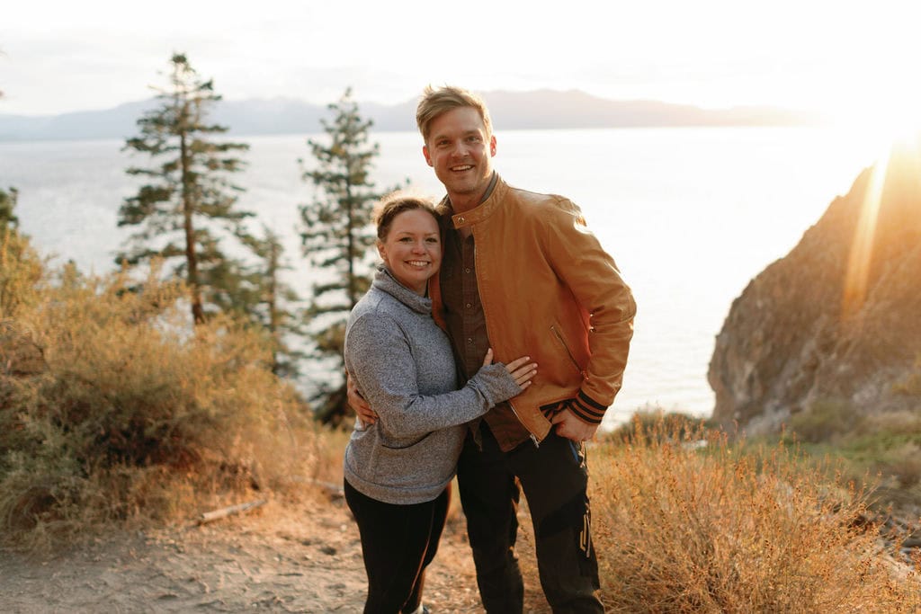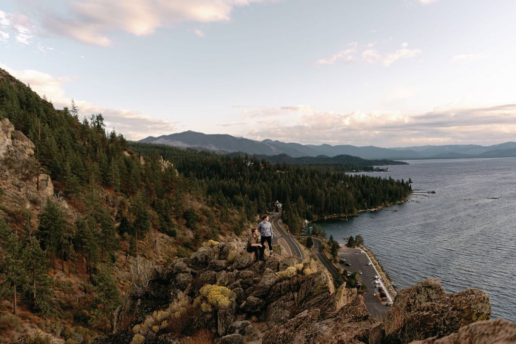 From there, we headed to Cave Rock for sunset. This is hands-down one of my favorite spots in Tahoe. The wind lingered, adding an adventurous feel as golden light spilled across the lake. While Cave Rock can get a little crowded at sunset, it’s always worth it for the epic views. Katlin and Kyle leaned into the magic of the moment, taking in the kind of golden-hour glow that makes a South Lake Tahoe engagement session unforgettable.