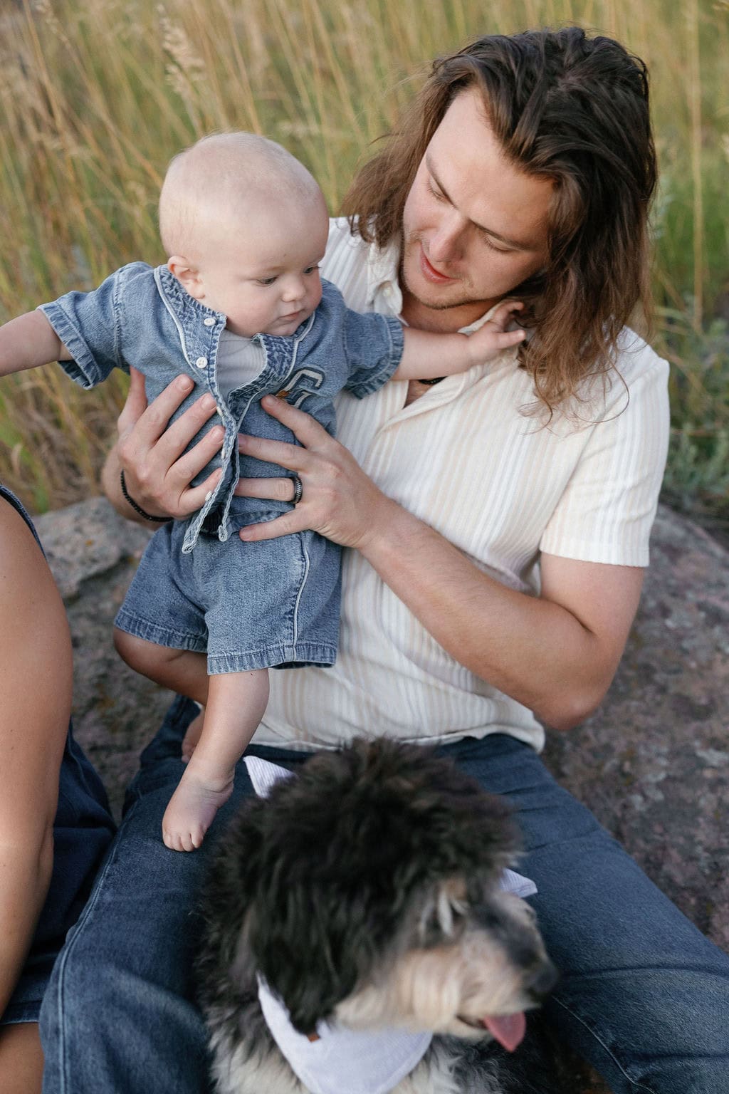 Sweet portrait of family at chautauqua park in boulder. Dad lifts their baby inot the air