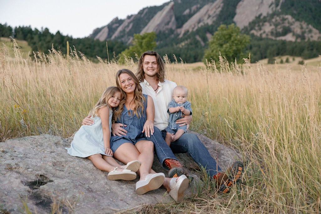 Sunrise family portraits at chautauqua park in the summertime, family sitting on the rock together