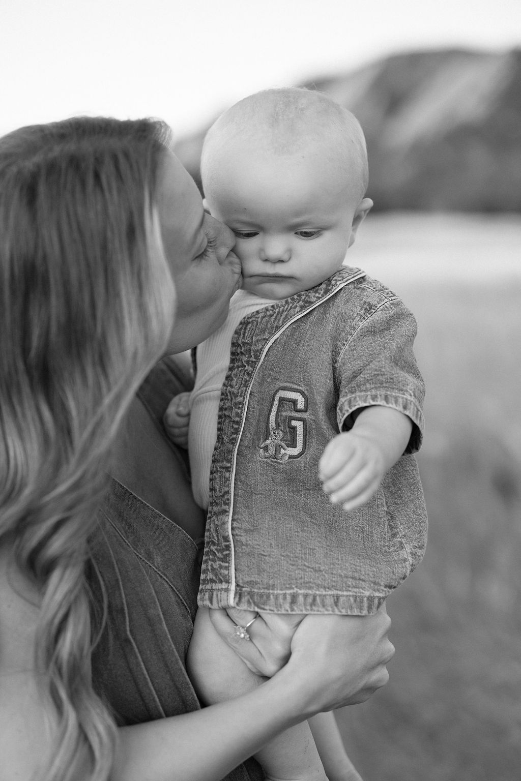 mom snuggles her baby at her Family photo session at chautauqua park in boulder