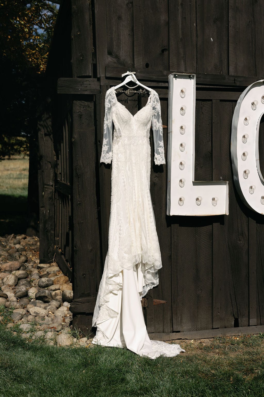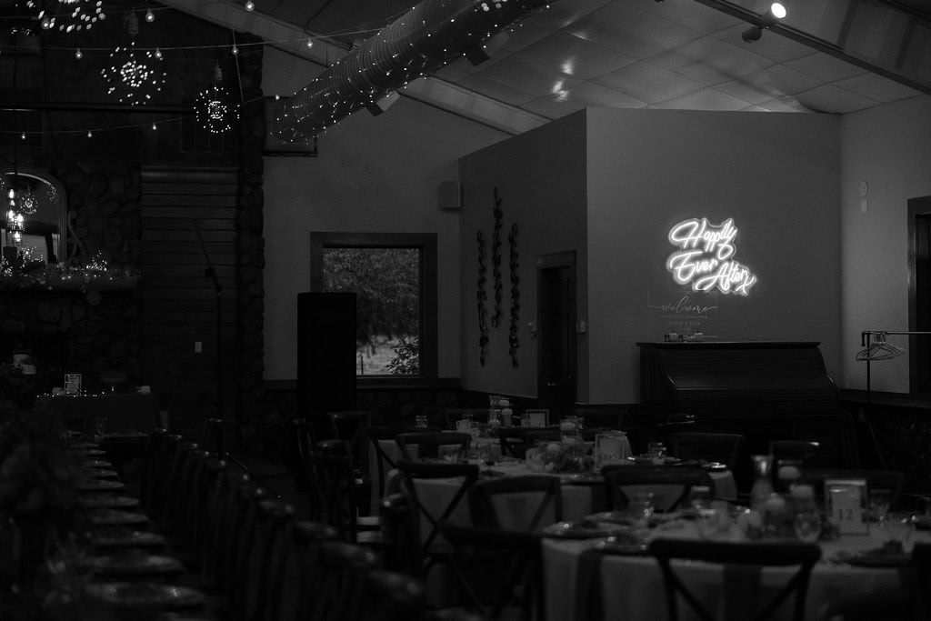 Shupe Homestead wedding reception set up. Light up sign that says Happily Ever After