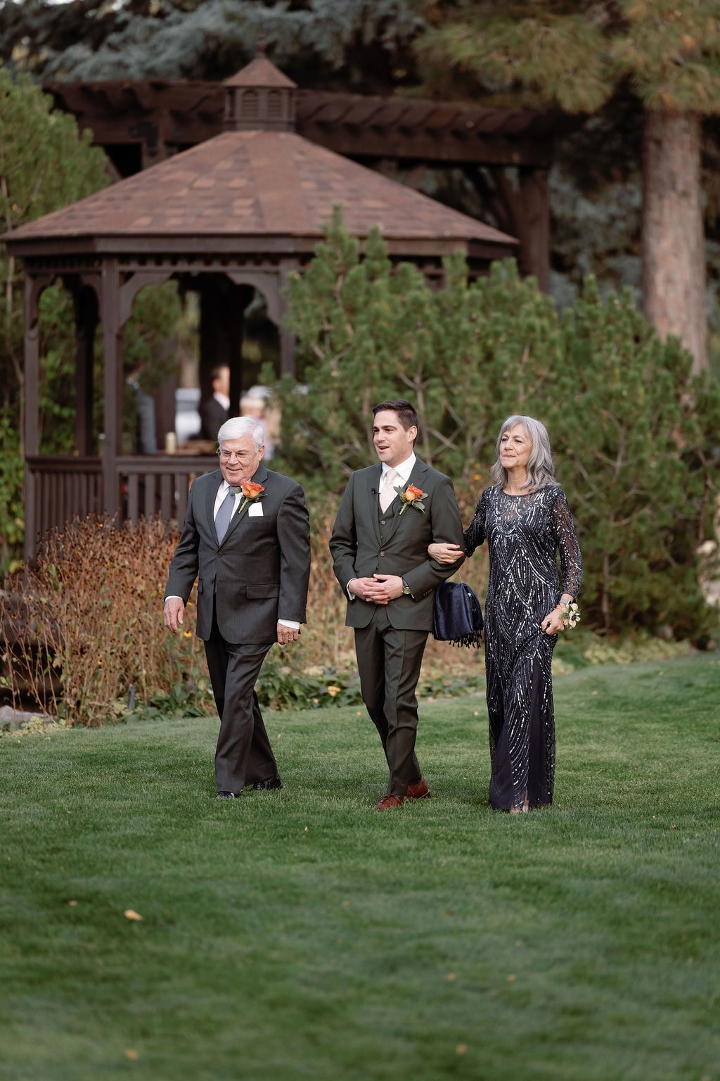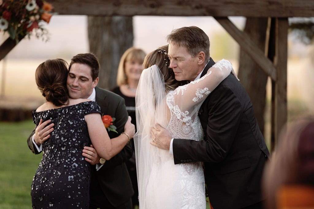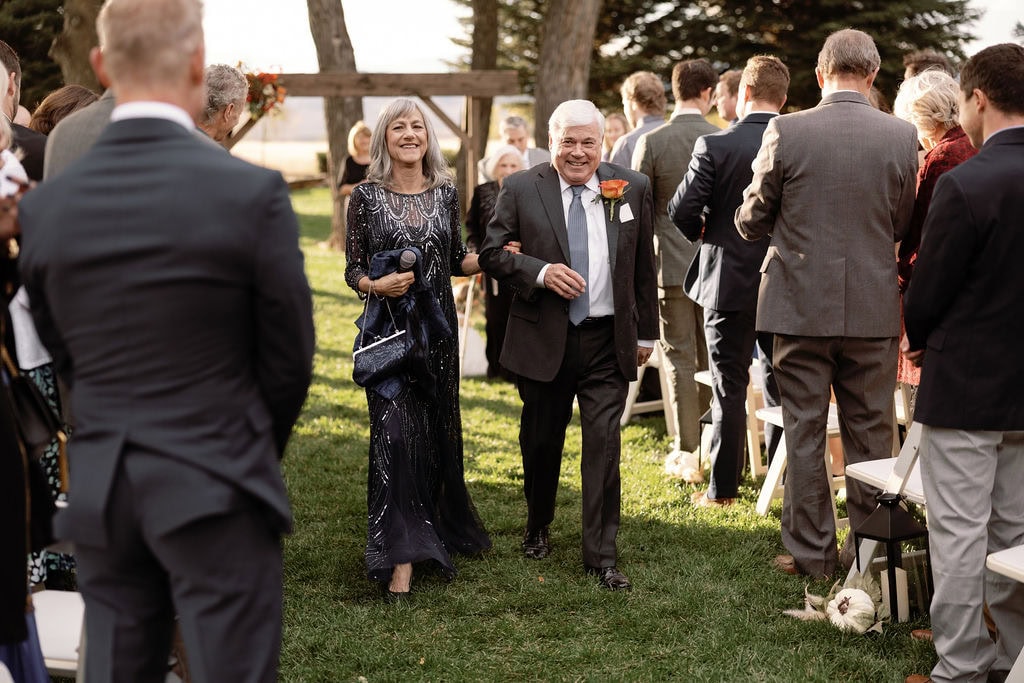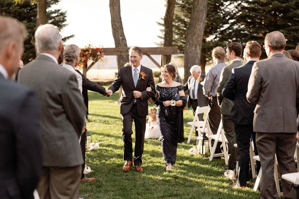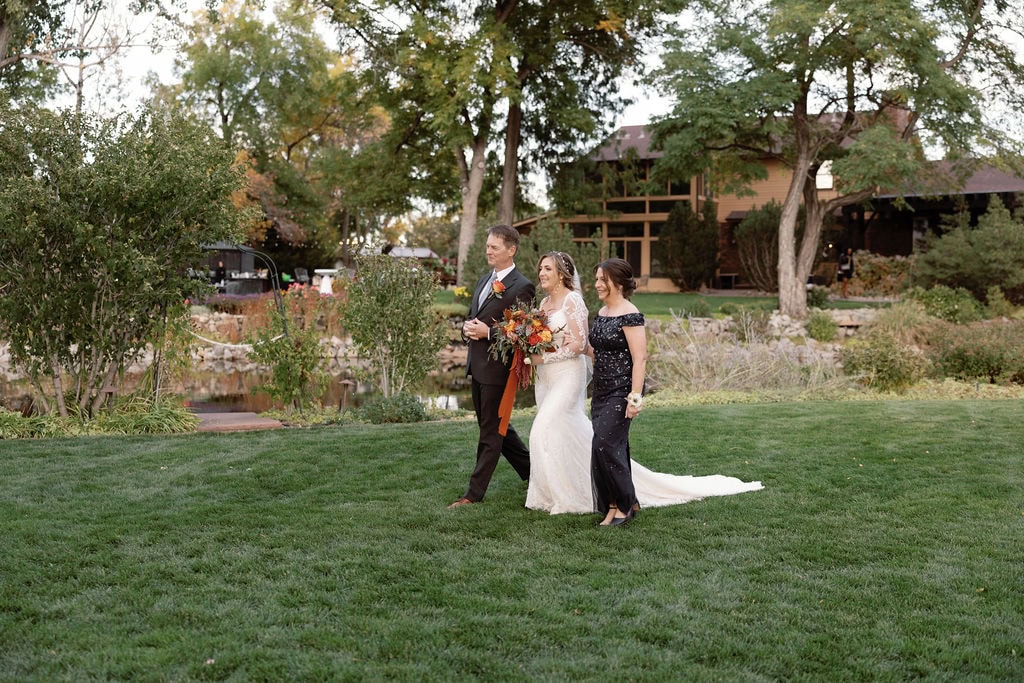 Beautiful fall wedding ceremony, bride walks down with her parents at shupe homestead boulder wedding venue