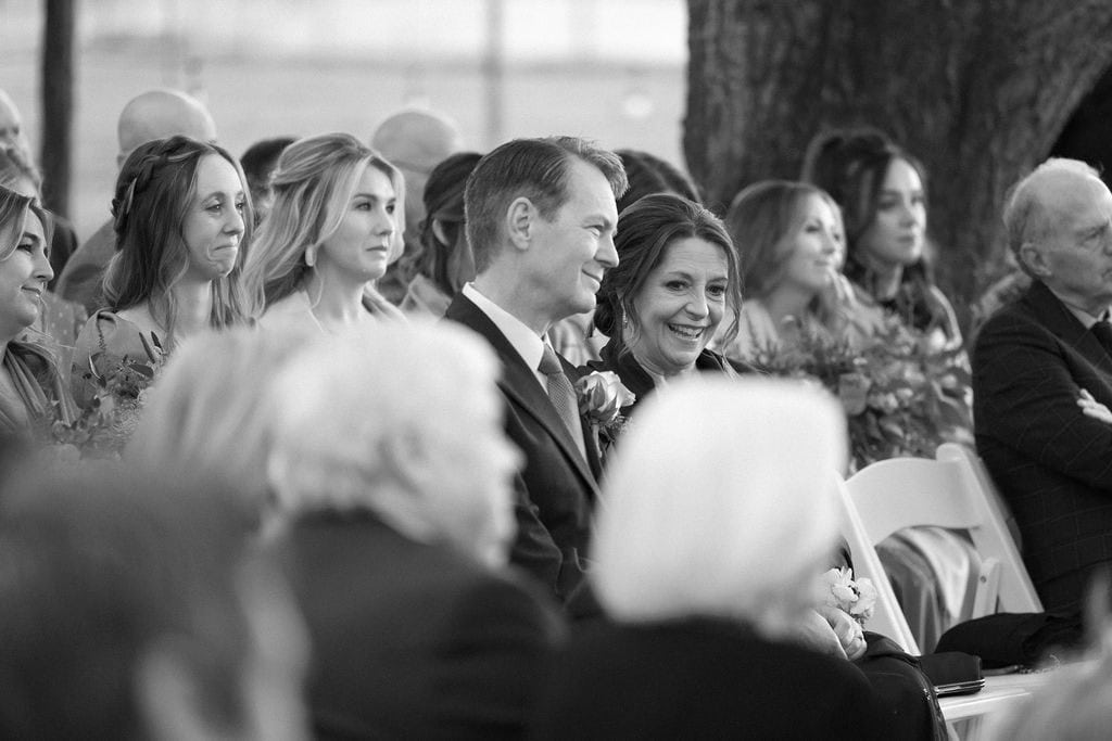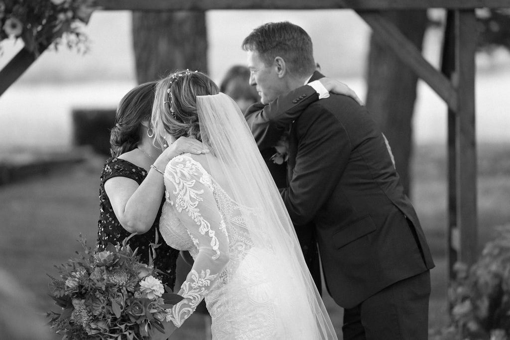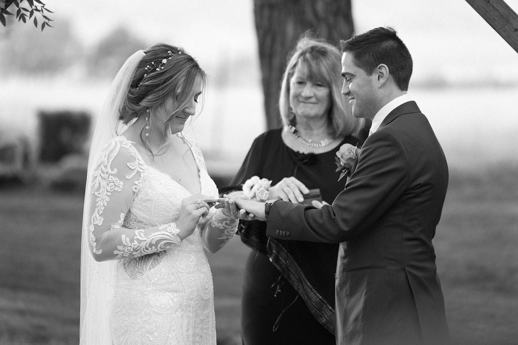 Gorgeous black and white photo of shupe homestead wedding ceremony in the fall
