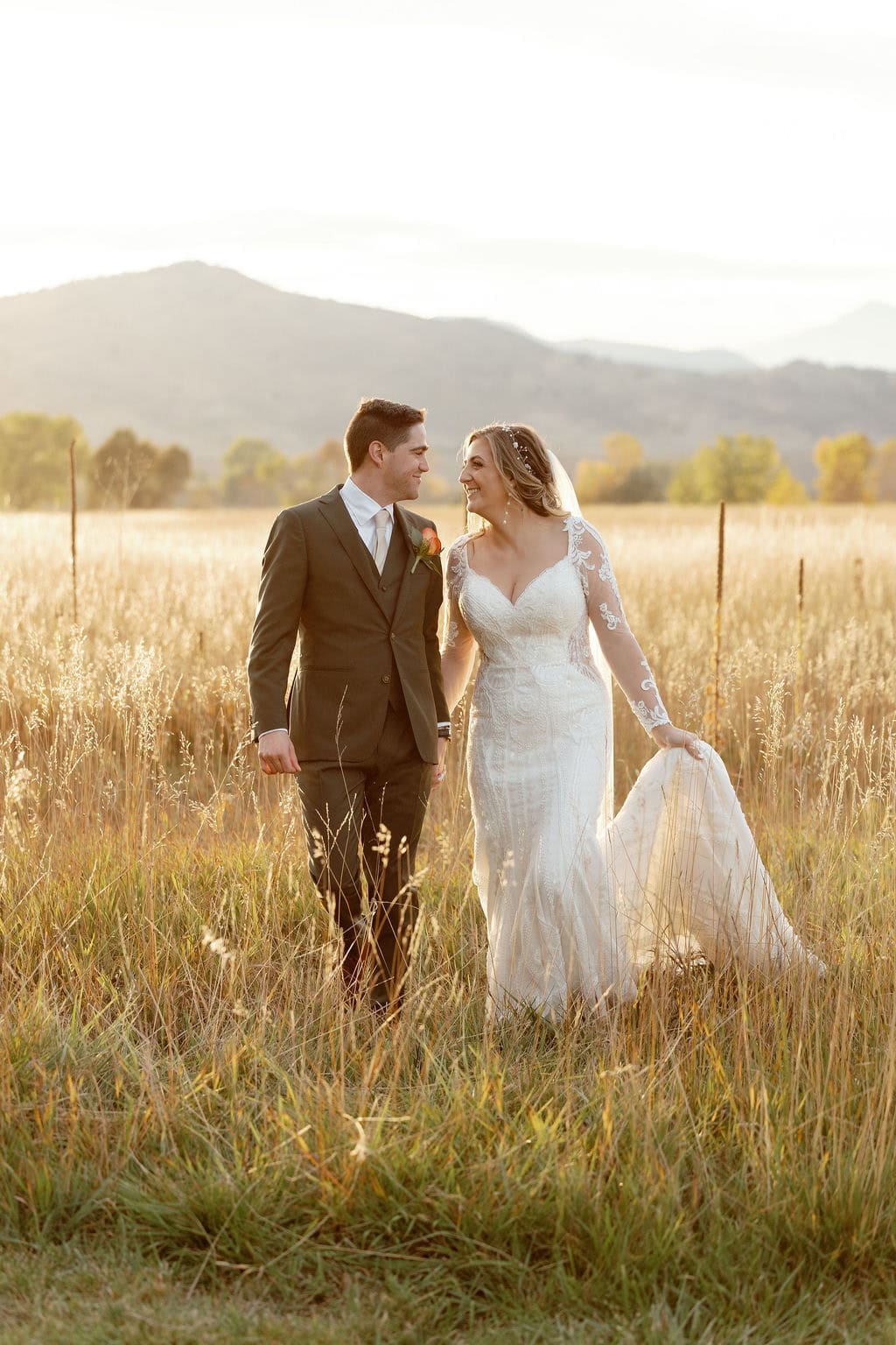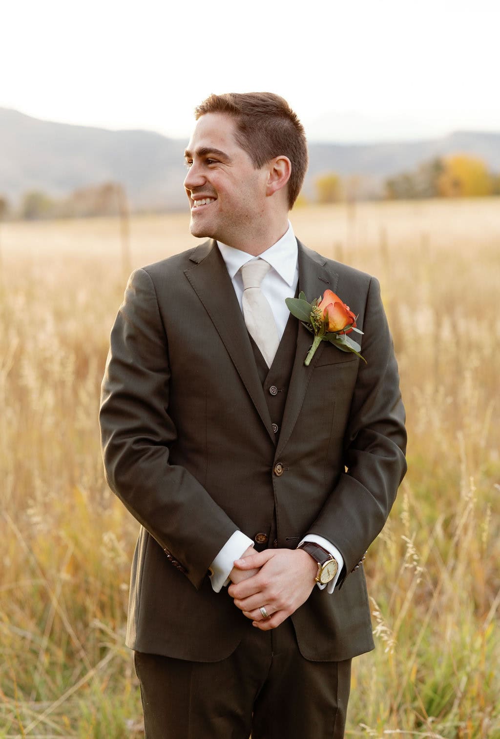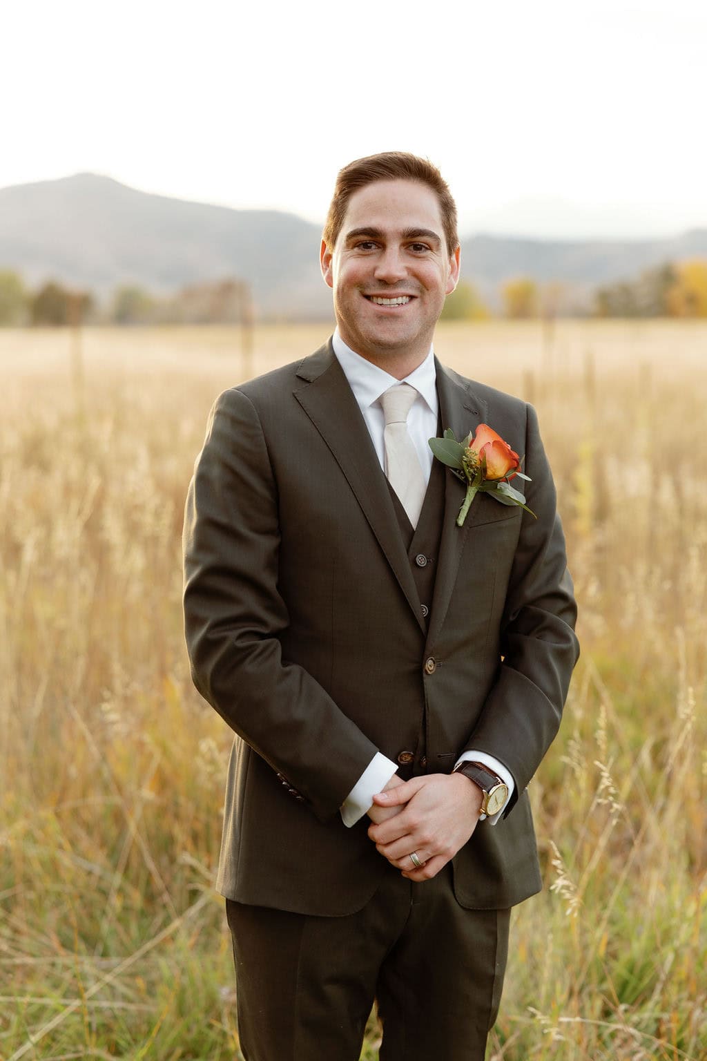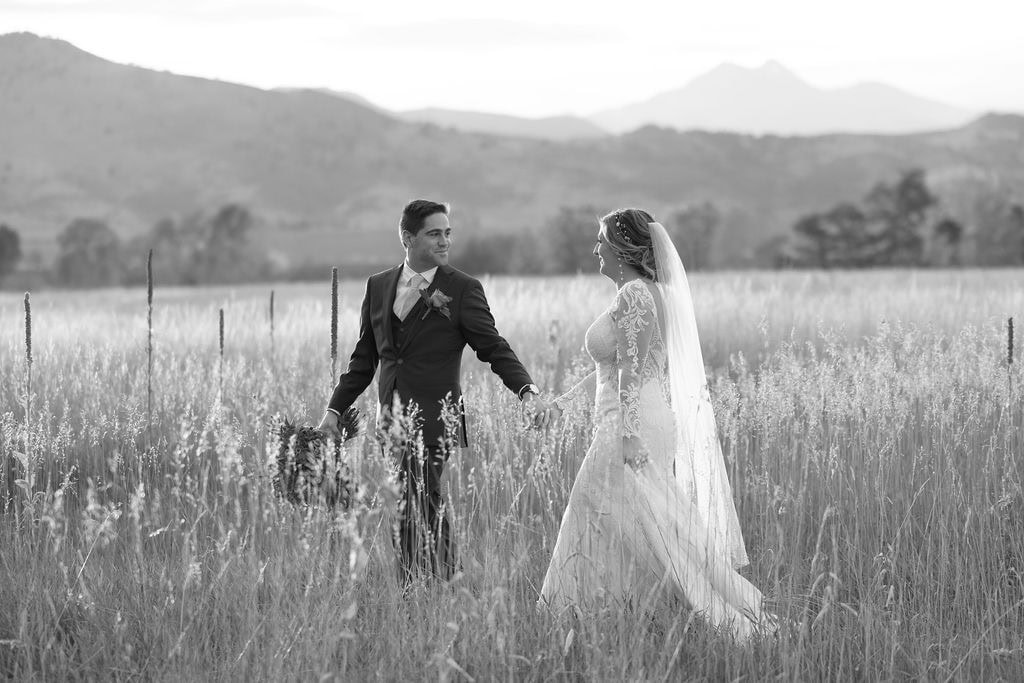 Bride and Groom Portraits at their Shupe Homestead Wedding outside in a field at sunset near boulder colorado