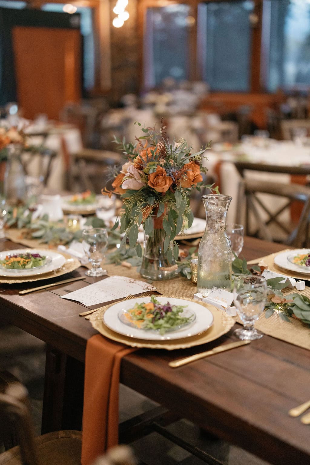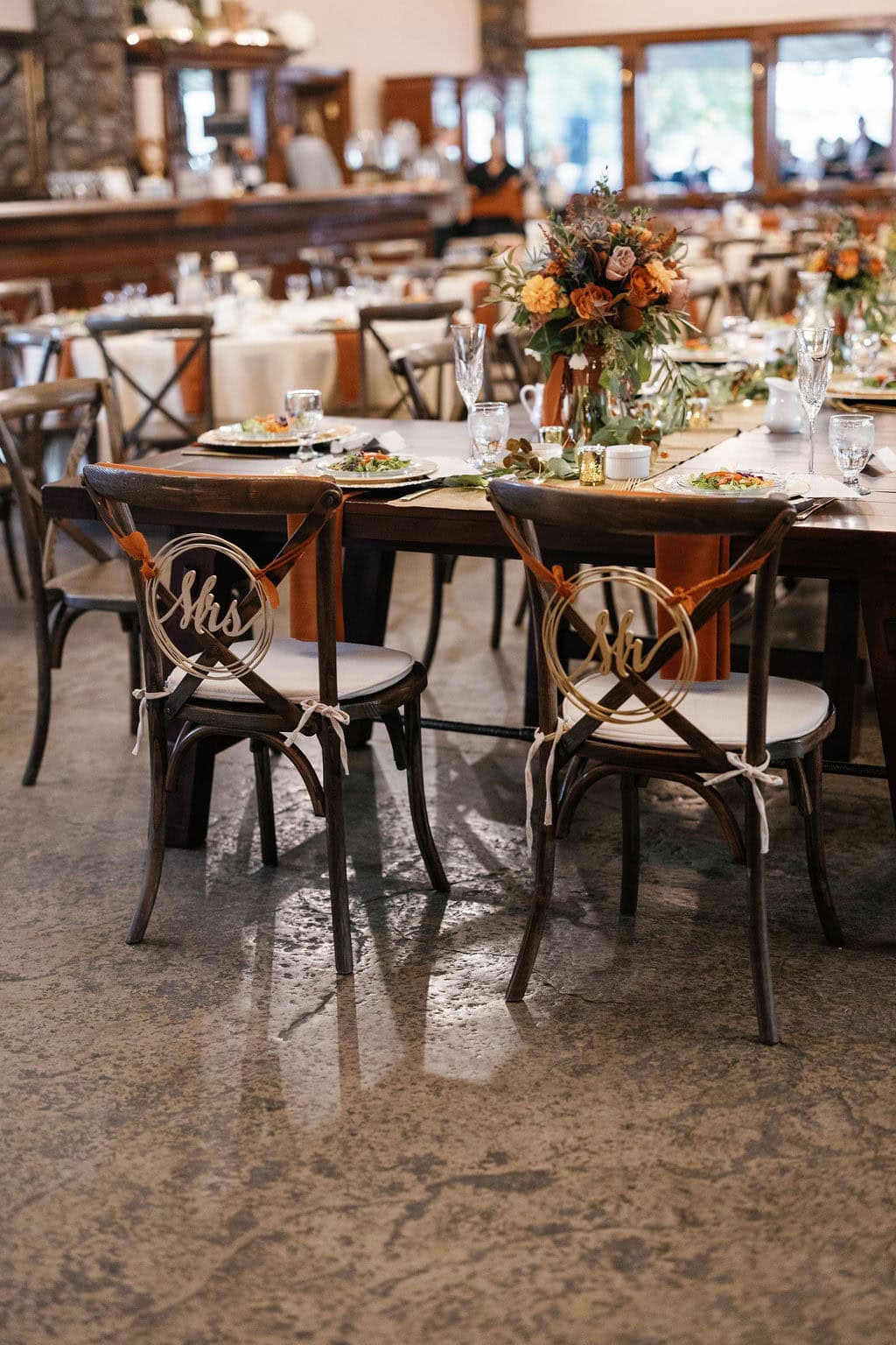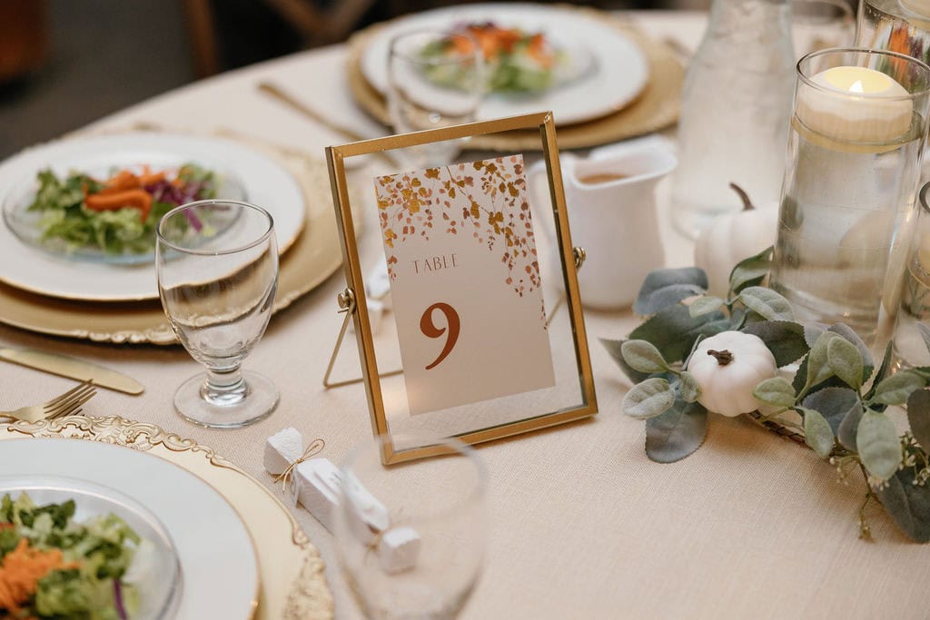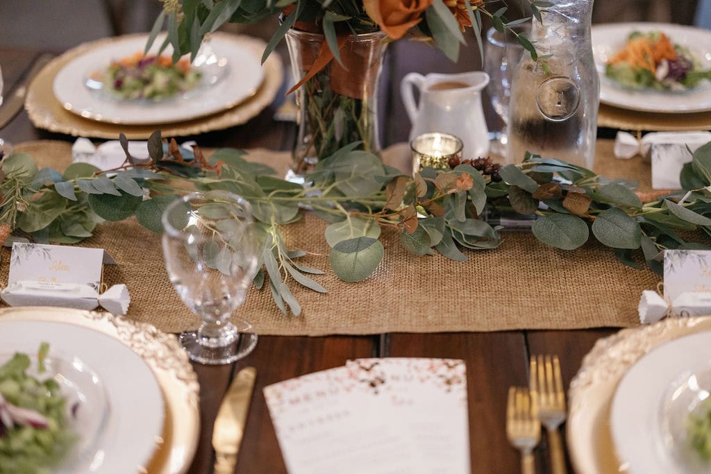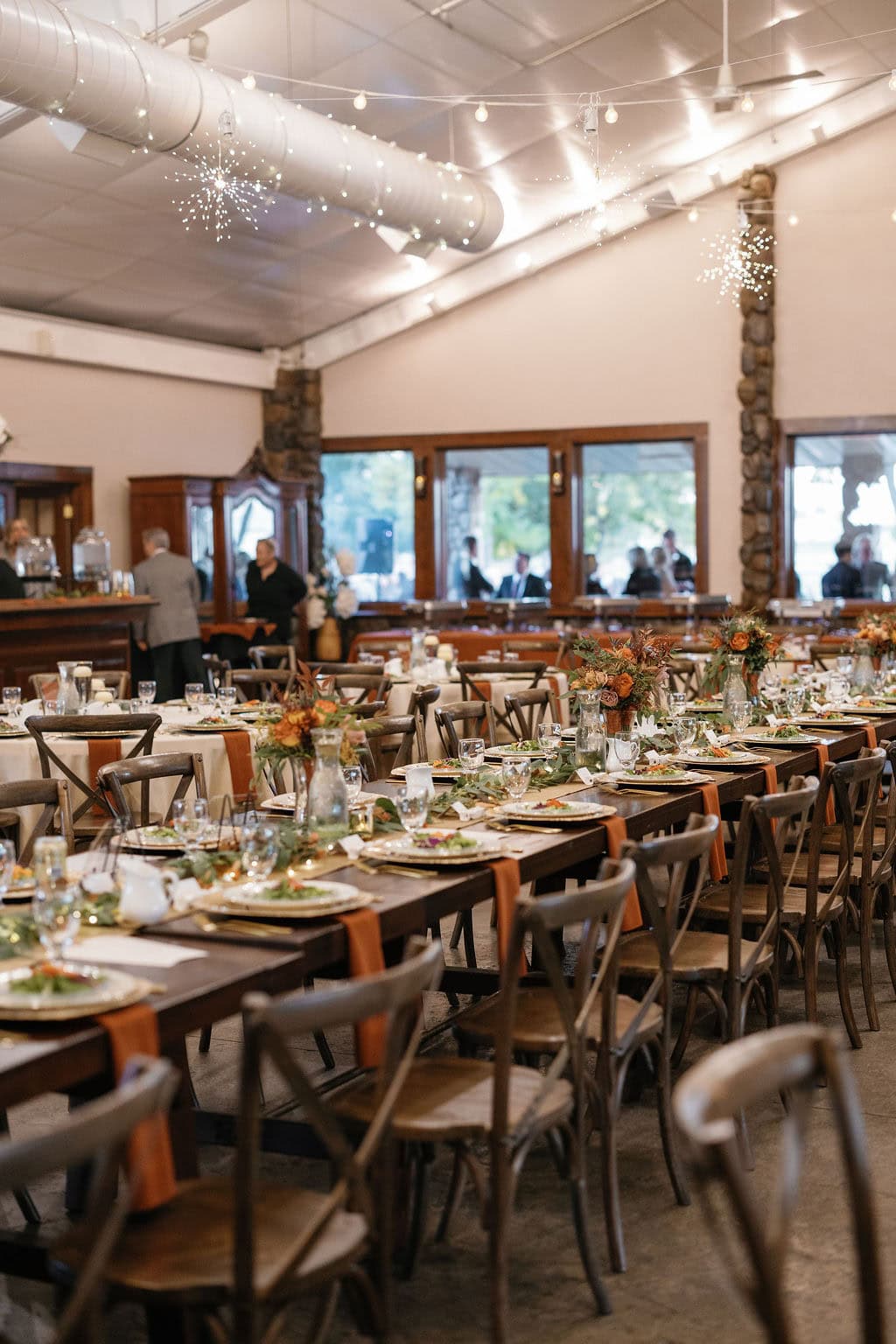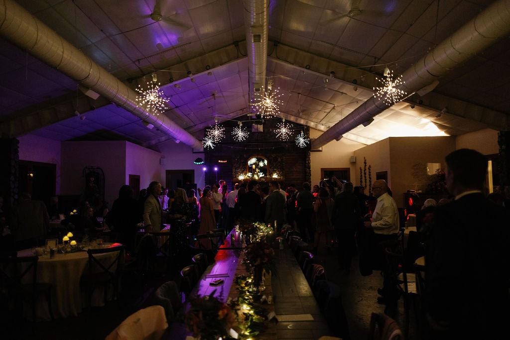 Shupe Homestead Wedding Reception Set Up and Details at a gorgeous fall wedding with hanging sparkling lights and warm tones in the details