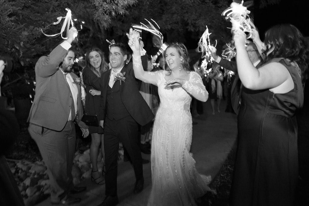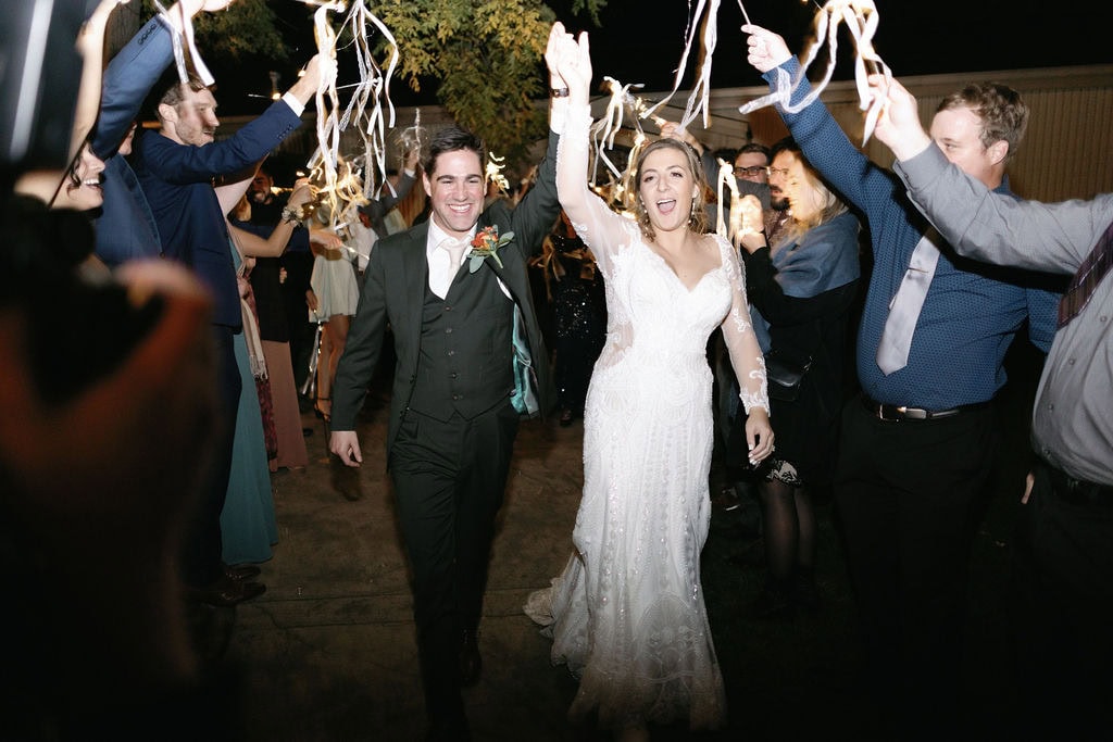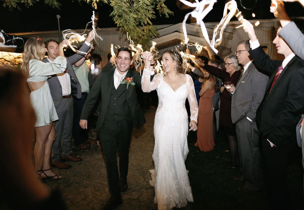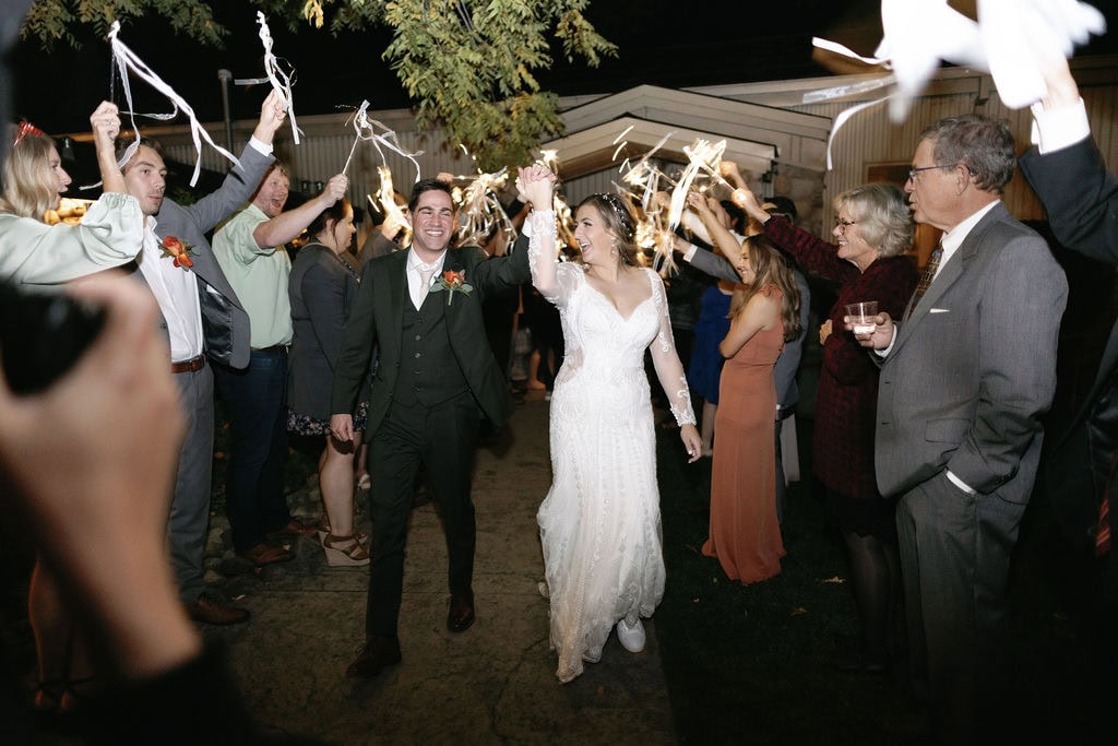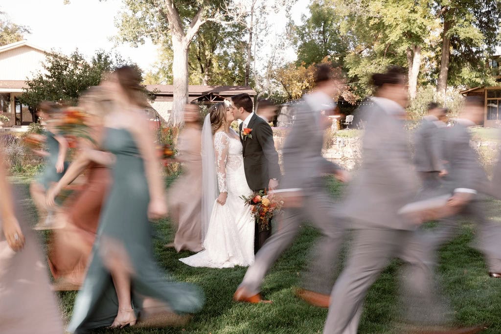 Bride and groom kiss during their wedding exit at their Shupe Homestead Wedding