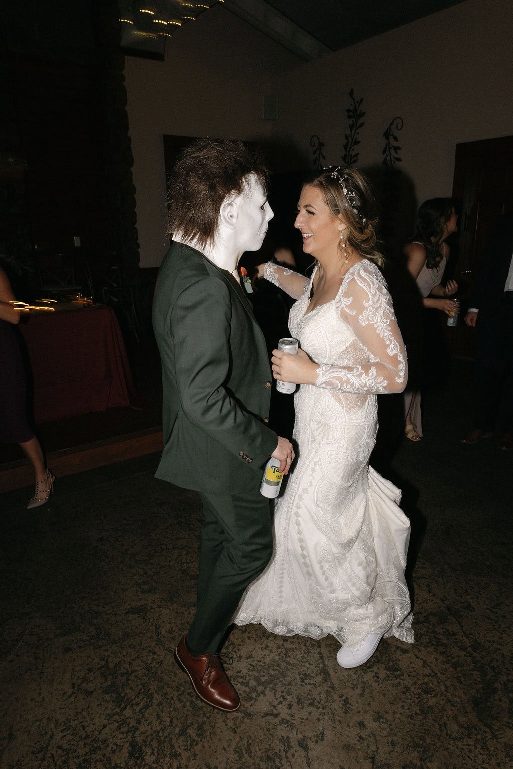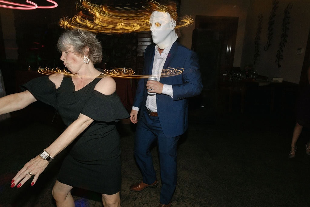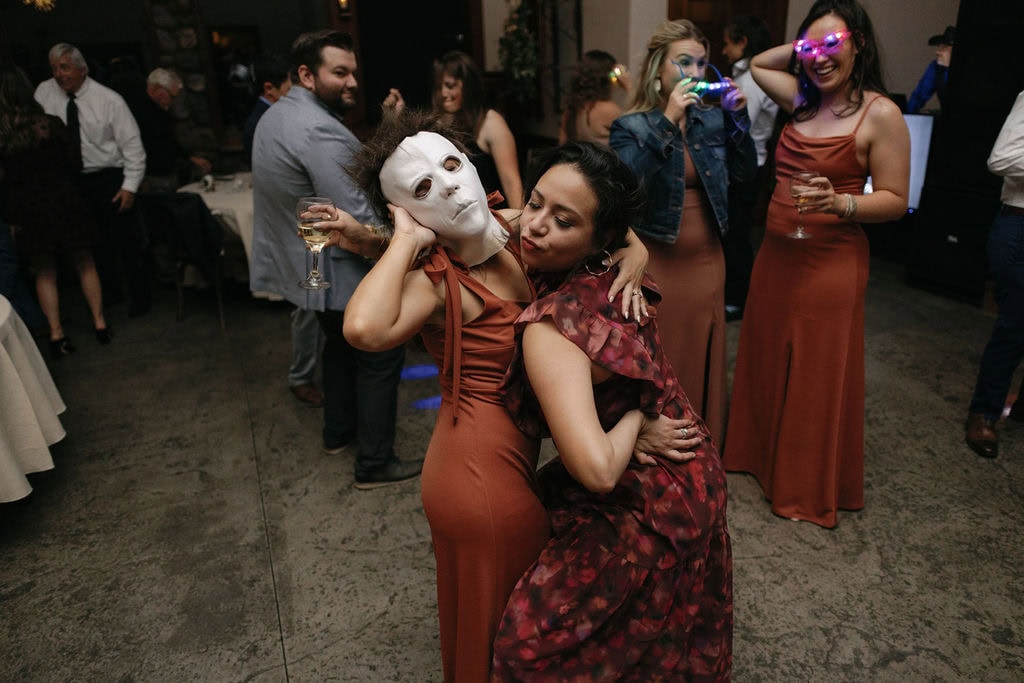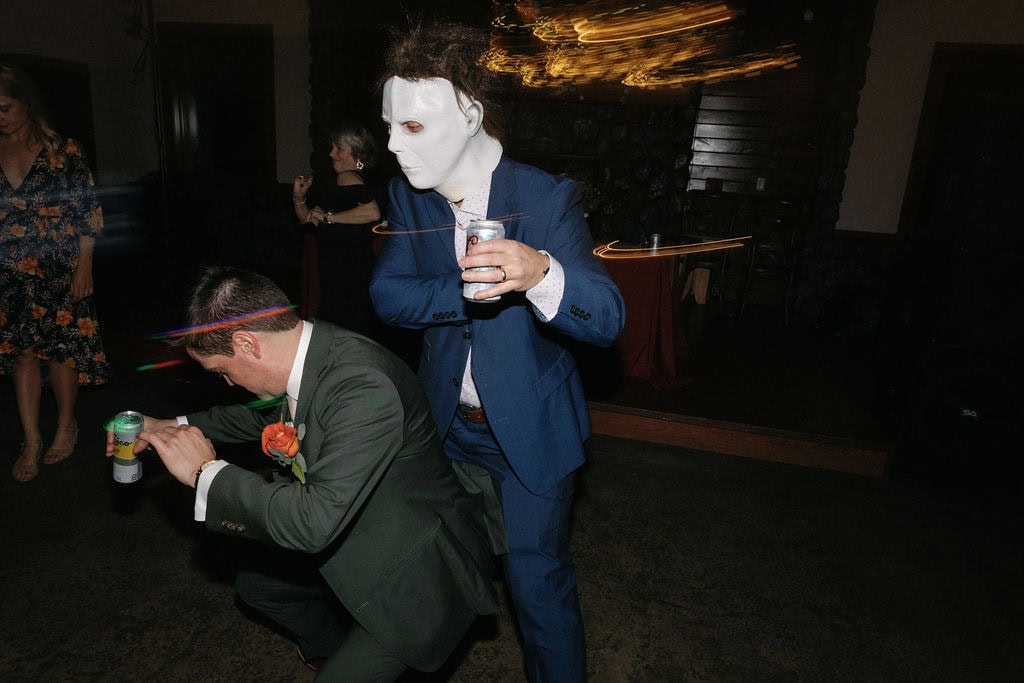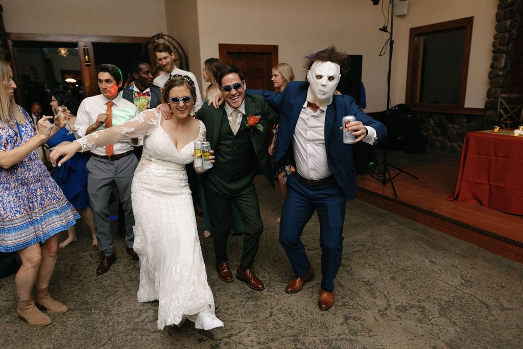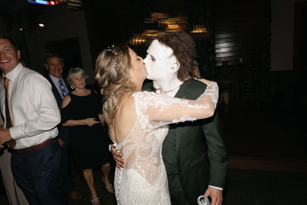 Groom puts on a mike myers mask and dances with his bride at their october shupe homestead wedding